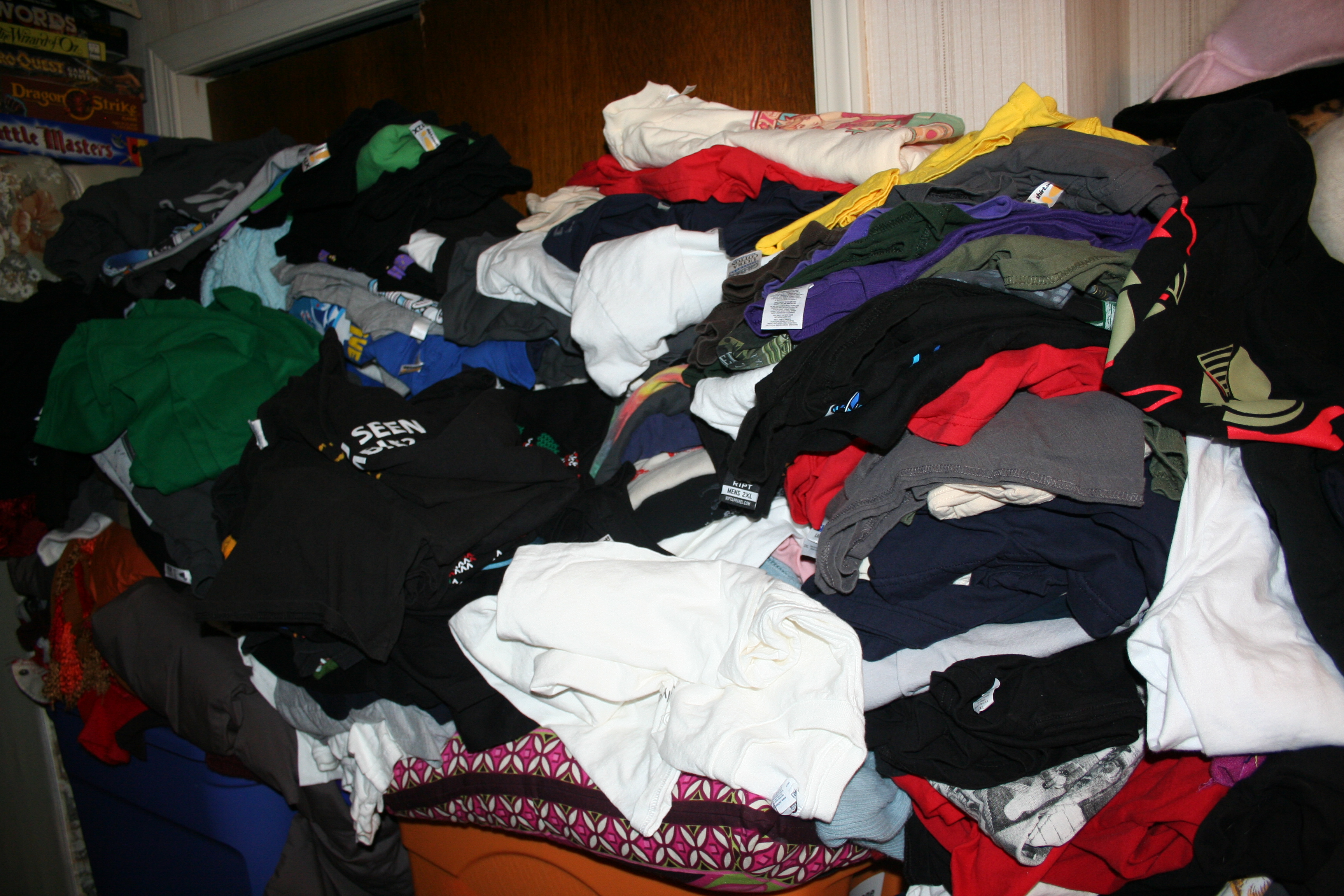 Skotte (my better half) and I love tshirts. We own way too many. In fact, there are so many piled up that it created an avalanche. It’s a good thing the dog was sleeping. Apparently, the shirts made a nice thunking noise when they hit the wood floor.