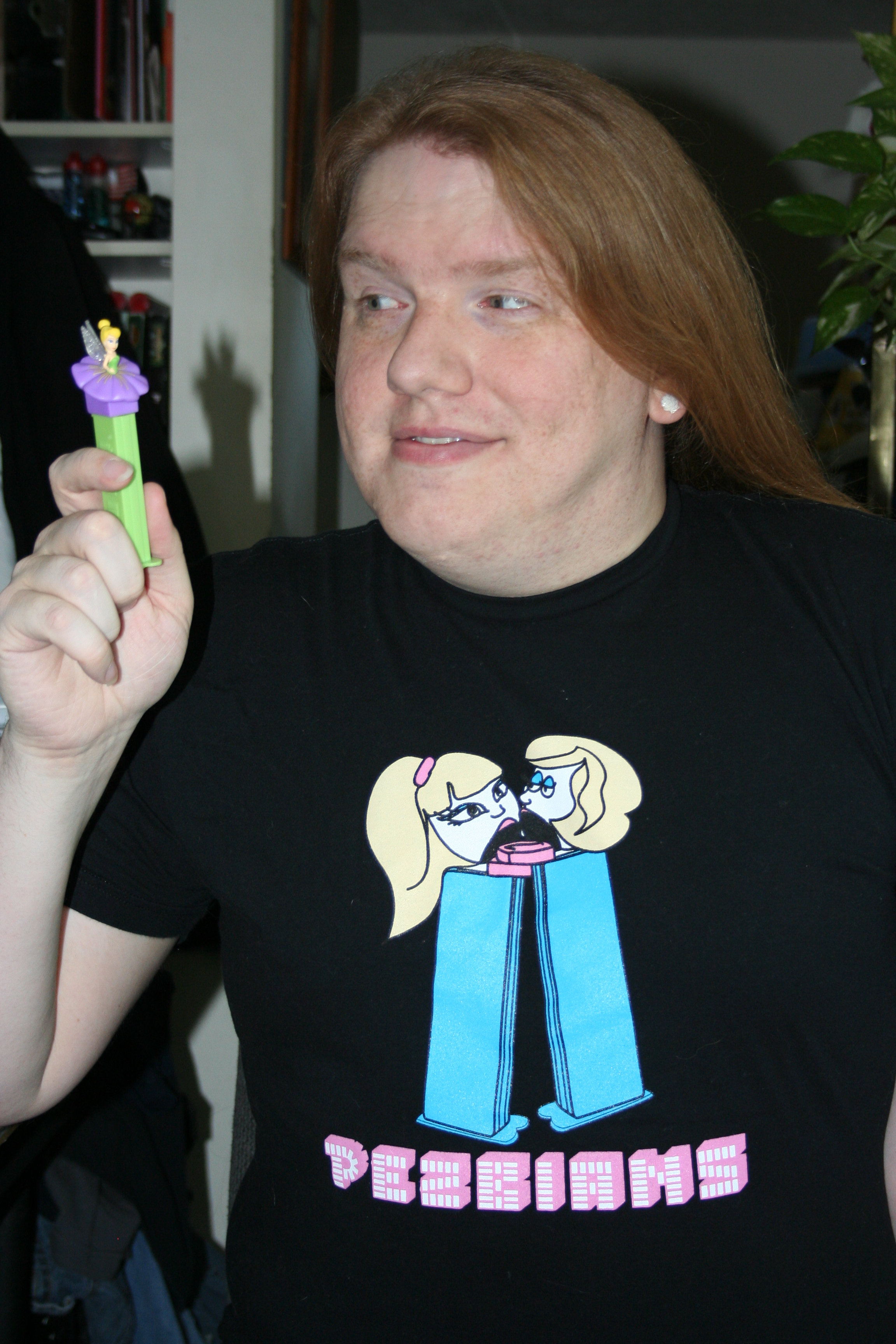 Hi!  Skotte here.  I wear this shirt very carefully, and apologetically.  I fFeel like it’s kind of an insulting shirt.  It’s a simple play on words, but it’s kind of offensive, innit?  I mean, it’s got these two over-made-up women’s heads, slipping each other the tongue (because that’s what lesbians do); they are cheap plastic candy dispensers, which i fFeel like a psychologist would tell us is a sort of encoding fFor sexuality or something; it’s got objectification of women; it’s got the male gaze … and as jokes go, it’s not even particularly clever.