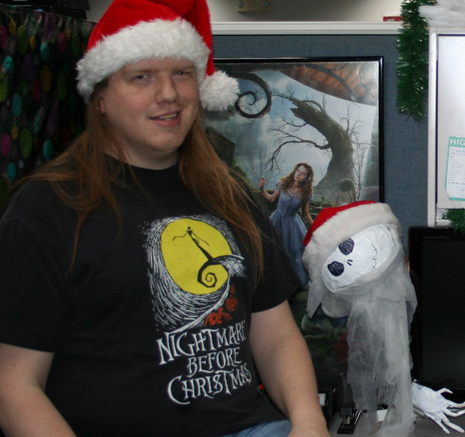The Nightmare Before Christmas is such a great movie! Skotte has a coworker-buddy who really really loves the film. She made a papier-mâché Jack Skellington, seen here peeking around her monitor. Pretty danged impressive! (Also, dig the Alice In Wonderland poster.)