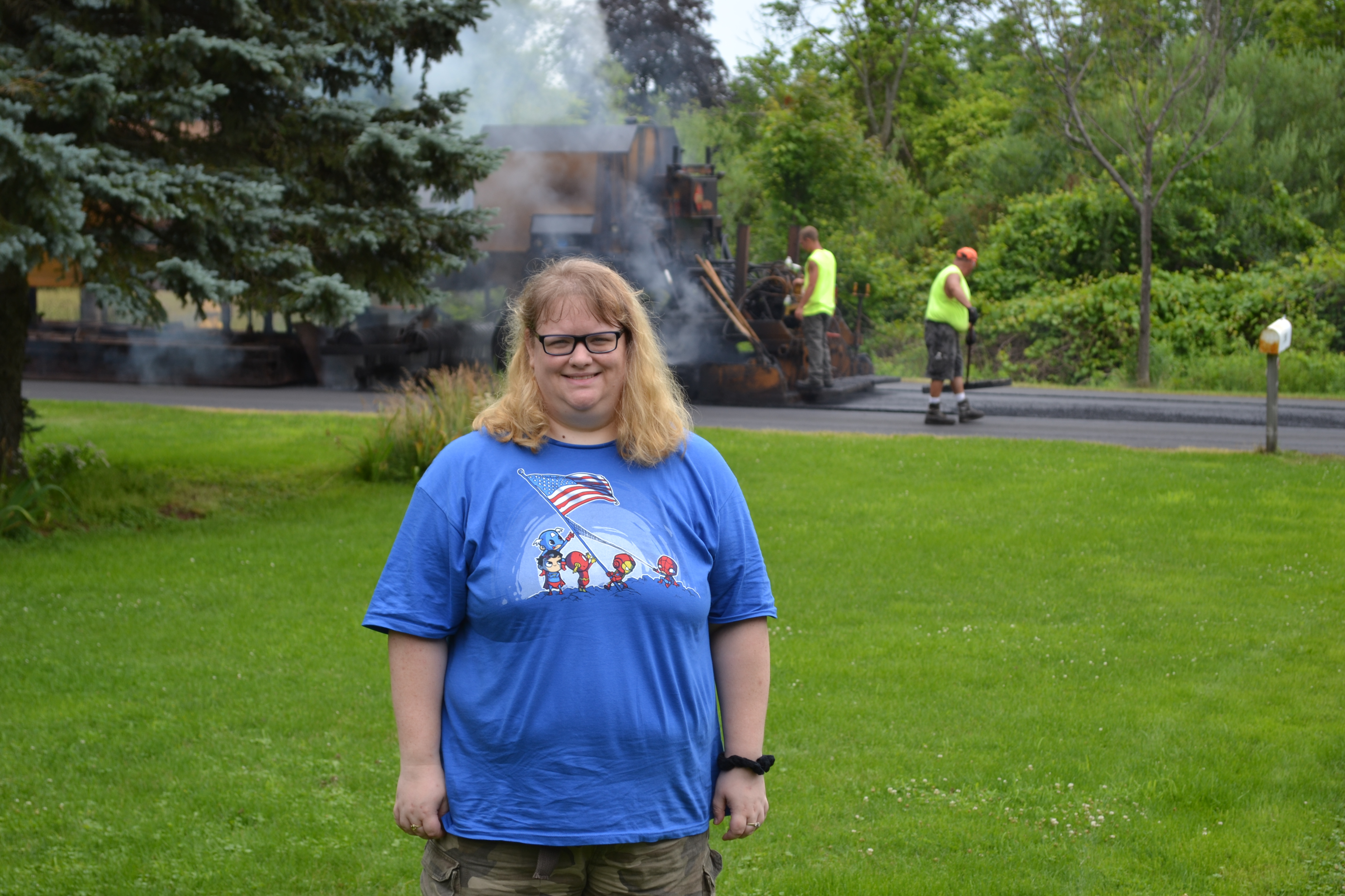So there we were, minding our business, when a giant set of machines and a couple dozen big men started repaving our street! The machine looked like it contained the very bowels of The Inferno! It was pretty cool, actually, tearing up the street at one end, and laying down shiny new blacktop at the other end of the machine. I was impressed!