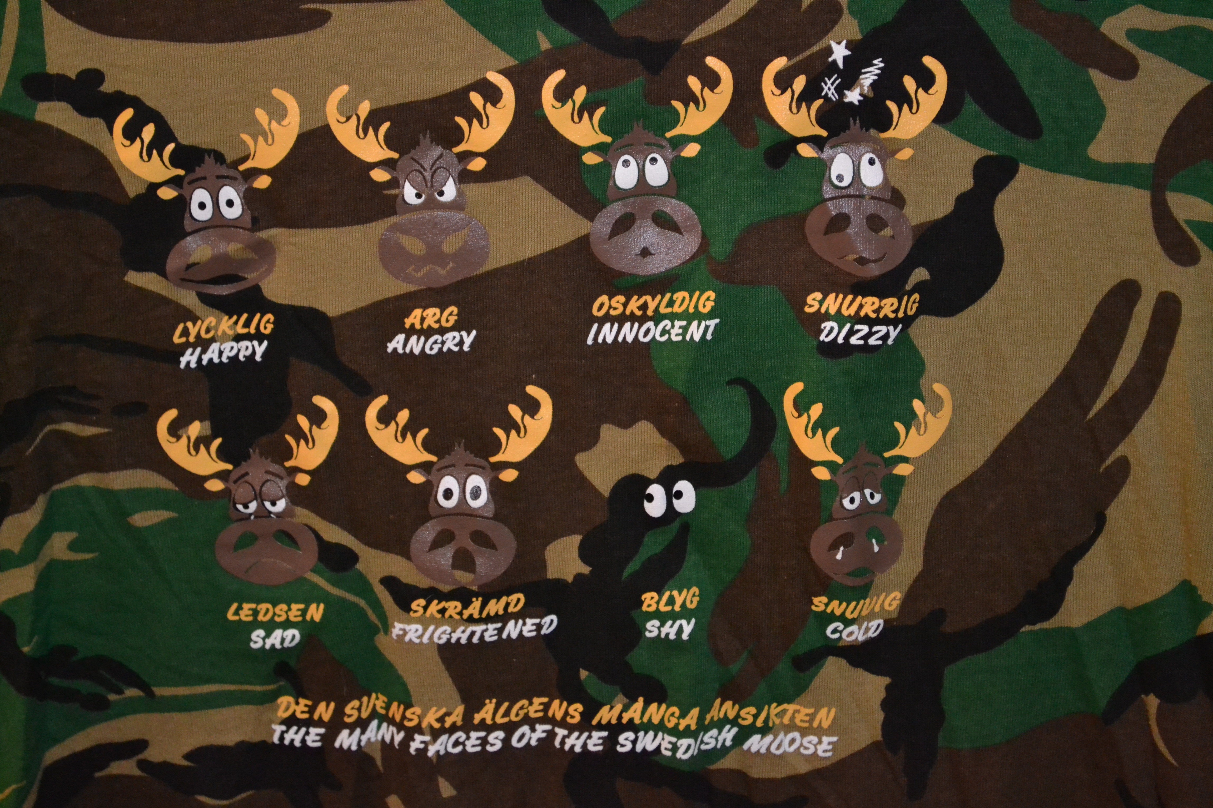 The shirt was bought as a gift a couple years ago, by Cori’s Aunt Vivi while on her trip to Sweden. It displays the Many fFaces of The Swedish Moose. I was trying to fFind it online somewhere to show you, but apparently it was sold at some sort of fFancy exclusive boutique fFor camouflaged moose apparel.